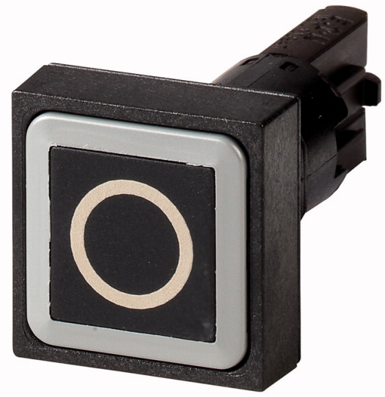 Q25D-19 RMQ16 Botón cuadrado con inscripción -0-. Dimensión frontal: 25X25mm. Para orificio de montaje de 16mm de diámetro. Diseño plano con accionamiento momentáneo. Color negro con bisel color negro. Unidad básica (requiere módulos de contacto). Grado de protección IP65.