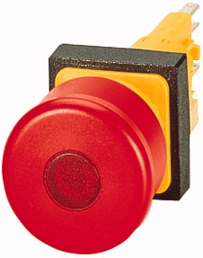 Q25LPV RMQ16 Botón paro de emergenciaIluminado . Diseño tipo hongo con 25X25mm de diámetro de cabezal. Cabezal tipo hongo color rojo y base amarilla. Jalar para liberar. Unidad basico (requiere adaptador y módulos de contacto). Grado de protección: IP65.