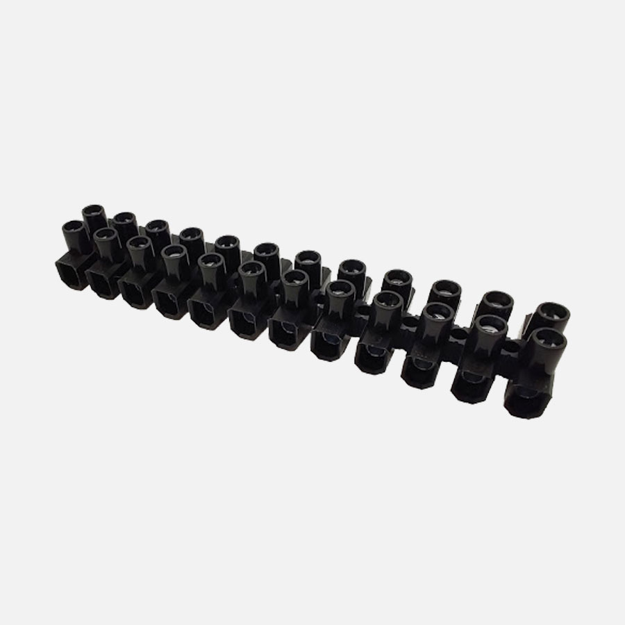 Regleta de conexión de 12 polos. Capacidad de conexión de 4mm² (22-14AWG). Indicado para una carga de 24A a 450VCA. Conexión atornillada. Hecho de polipropileno. Color negro.
