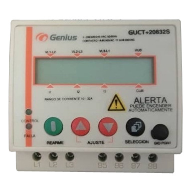 Relevador trifasico de proteccion integral para motores. Protección contra fallas de fase, sobrecargas y subcargas. Interruptor horario, horometro, medidor de factor de potencia y energia. Clase térmica ajustable. Tension: 208/220V. Corriente a carga plena (FLA) de 3.5-12.5A.