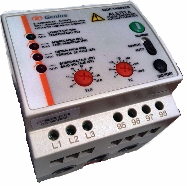 Relevador trifásico de protección integral para motores. Protección contra fallas de fase y sobrecargas. Disparo térmico 10. Tensión: 440/480V. Corriente a carga plena (FLA) de 10-32A.