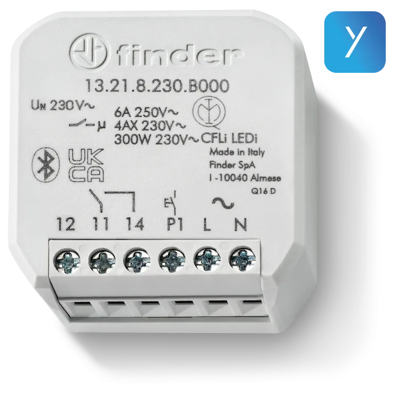 13.21.8.230.B000 Relé multifunción electrónico con Bluetooth YESLY. Funciones: 21 funciones selectivas (telerruptor, temporizador, automático de escalera) para luces y ventiladores. protocolo de transmisión bluetooth low energy (ble). conexión con criptografía a 128 bites. Tensión de mando de 110-230VCA. Equipado con contactos 2NA. Material de los contactos: plata niquel (AgNi). Indicado para una corriente nominal de 16A a tensión de 250VCA. Dimensiones: 52.8Hx49.3Wx18.9Dmm. Montaje en caja de derivación. Temperatura de operación -10°C~50°C. Aprobaciones: CE, UKCA, EAC. Protección IP20.