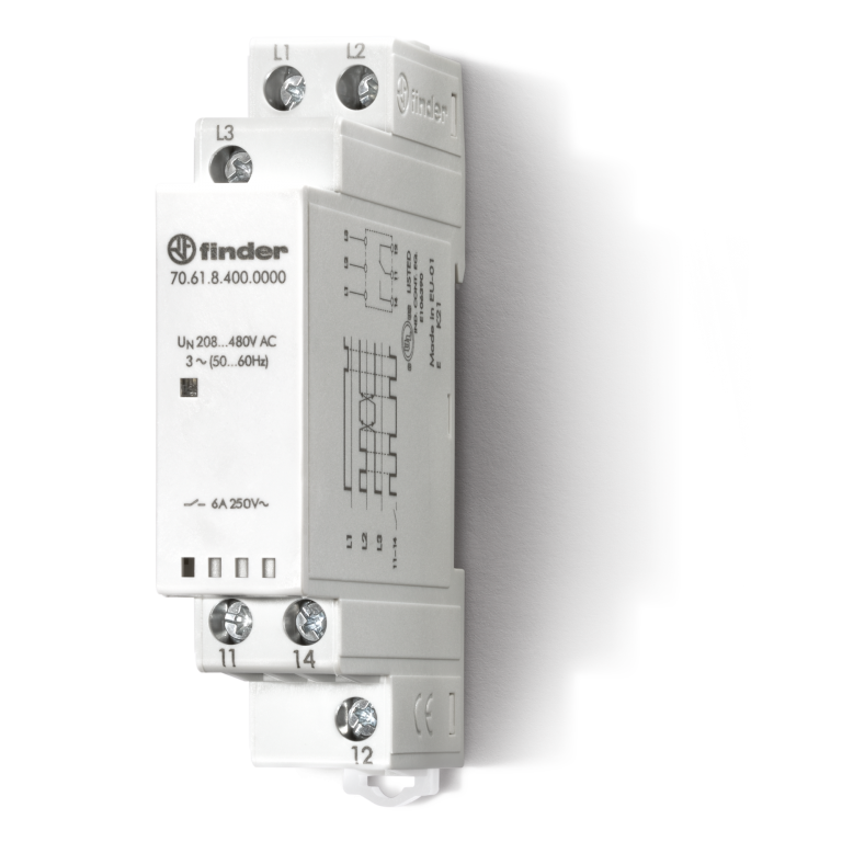70.61.8.400.0000 Relé de vigilancia de fallo y secuencia de fases. Ofrece 1 contacto conmutado con conexión a tornillo el cual soporta una carga de 6A a 250/400 V. Cuenta con valores de detección no ajustables y con tiempo de retardo a la desconexión fijo. Fabricado para proteger contra fallo de fase y secuencia de fase. El Relé para su funcionamiento, se alimenta de 208-480VAC. Para más información, favor de consultar la ficha técnica del producto.