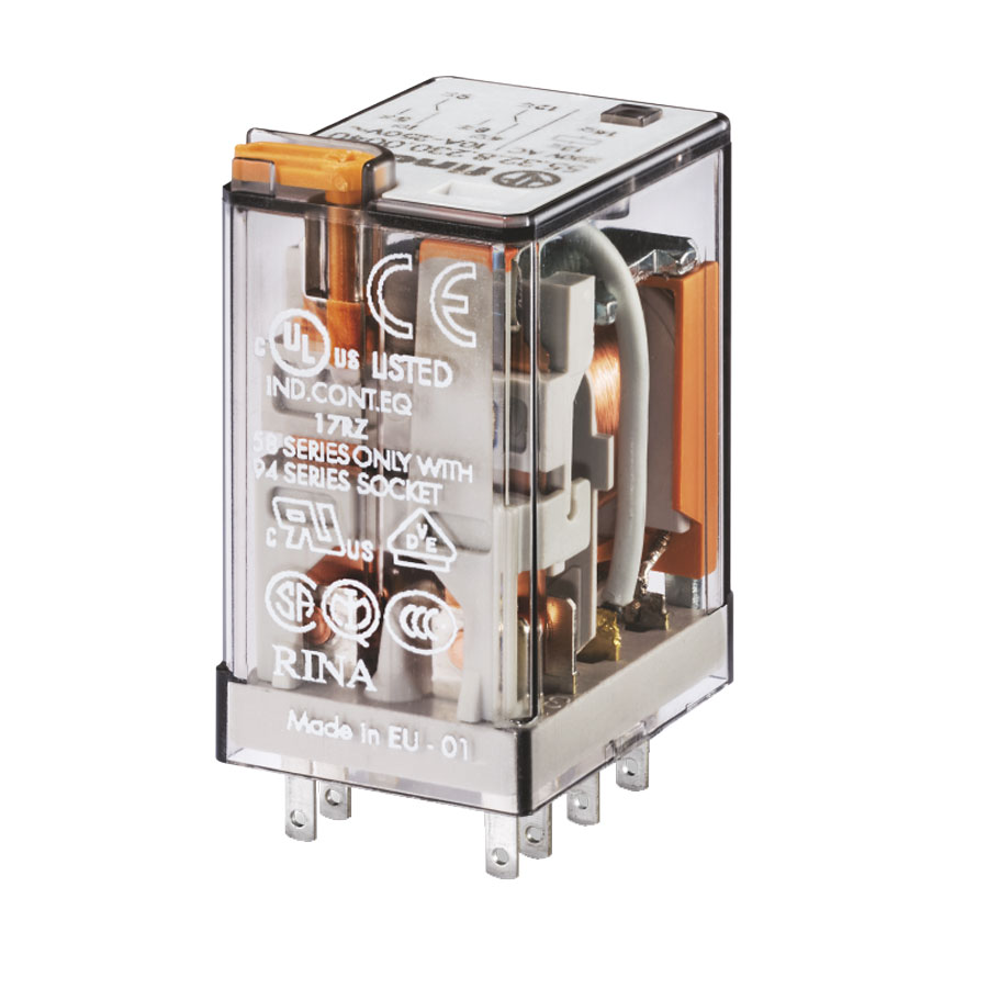 55.32.8.012.0040 Relevador / Relé industrial para aplicaciones generales. Tensión de circuito de mando 12VAC. Dos contactos conmutados 2CO (2NA2NC), material de los contactos AgNi (Plata Níquel), con capacidad de carga de 10A a 250VCA, 8 pines tipo fastón, para enchufar. Cuenta con: pulsador de prueba + indicador mecánico. Para montar en bases serie 94. Aprobaciones: CE, ANCE, CCC, CSA, EAC, ENEC, IMQ, Lloyd’s Register, RINA, UL, DVE