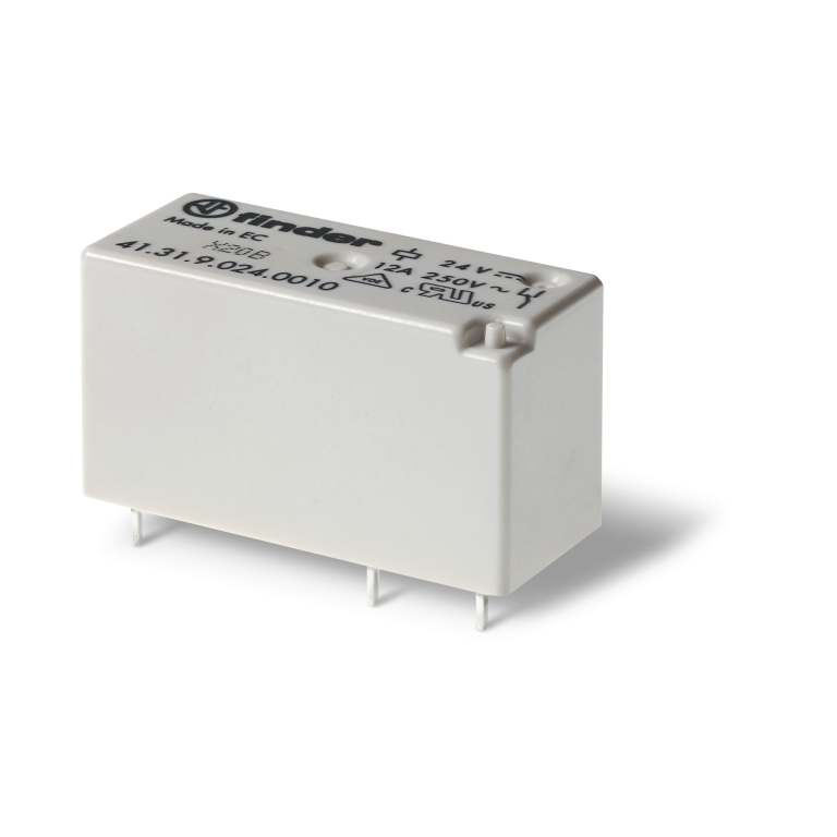 41.31.9.024.0010 Mini-Relevador / Relé para circuito impreso. Tensión de circuito de mando 24VCD. Un contacto conmutado 1CO (1NA1NC), material de los contactos AgNi (Plata Níquel), con capacidad de carga de 12A a 250VCA, 5 pines tipo aguja, reticulado 3.5mm. Para montar en bases serie 93 y 95.13/15. Aprobaciones: EAC, ENEC, UL, RINA, DVE