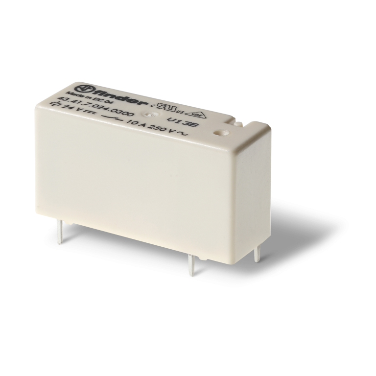 43.41.7.005.2000 Mini-Relevador / Relé para circuito impreso. Tensión de circuito de mando 5VCD. Un contacto conmutado 1CO (1NA1NC), material de los contactos AgCdO (Plata Oxido de Cadmio), con capacidad de carga de 10A a 250VCA, 5 pines tipo aguja, reticulado 3.2mm. Para montar en bases serie 95.23. Aprobaciones: EAC, ENEC, UL, RINA, DVE
