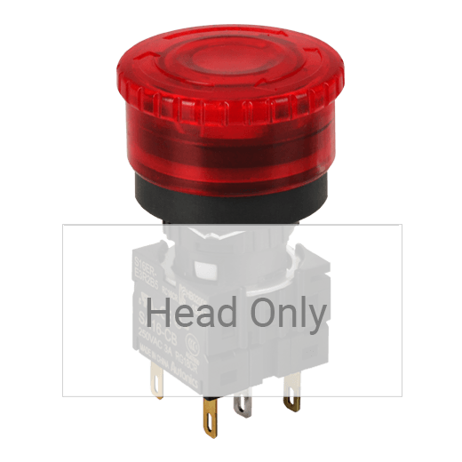 S16ER-E3R Botón paro emergencia. Diseño de cabezal tipo hongo, cabezal corto D30. Para orificio de montaje de 16mm de diámetro. Diseño con accionamiento girar para liberar. Color rojo. Unidad básica (Cabezal con adaptador), los contactos se venden por separado. Grado de protección IP65.