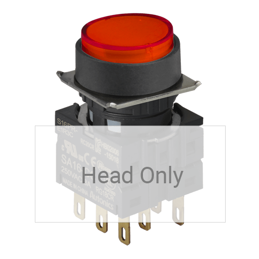 S16PR-E2R Botón pulsador. Para orificio de montaje de 16mm de diámetro. Diseño saliente con accionamiento mantenido. Color rojo. Unidad básica (Cabezal con adaptador), los contactos se venden por separado. Grado de protección IP52.