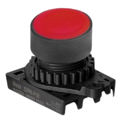 S2PR-P1R Botón pulsador. Para orificio de montaje de 22mm de diámetro. Diseño saliente con accionamiento momentáneo. Color rojo. Unidad básica (Cabezal con adaptador), los contactos se venden por separado. Grado de protección IP52.