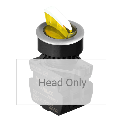 S3SFN-L1Y Selector de palanca corta en diseño de aleta de tiburón. Para orificio de montaje de 30mm de diámetro. Diseño de 2 posiciones con accionamiento momentáneo a 90° (izquierda 45°- derecha 45°). Color amarillo. Unidad básica (Cabezal con adaptador), los contactos se venden por separado. Grado de protección IP52.