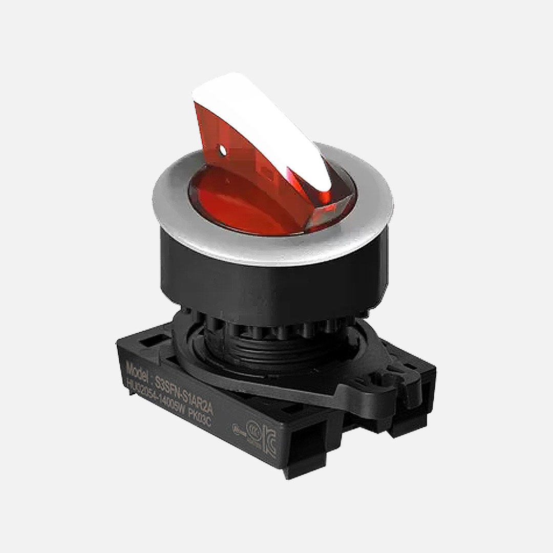 S3SFN-L5R Selector tipo palanca corta en diseño de aleta de tiburón. Para orificio de montaje de 30mm de diámetro. Diseño de 3 posiciones con accionamiento momentáneo a 60° (con retorno a posición central, izquierda 60°- derecha 60°). Color rojo. Unidad básica (Cabezal con adaptador), los contactos se venden por separado. Grado de protección IP52.