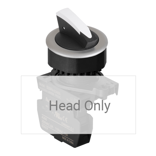 S3SFN-S1W Selector tipo palanca corta en diseño de aleta de tiburón. Para orificio de montaje de 30mm de diámetro. Diseño de 2 posiciones con accionamiento momentáneo a 90° (izquierda 45°- derecha 45°). Color blanco. Unidad básica (Cabezal con adaptador), los contactos se venden por separado. Grado de protección IP52.