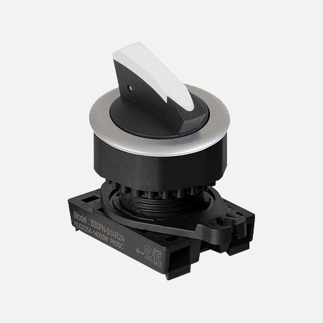 S3SFN-S7W Selector tipo palanca corta en diseño de aleta de tiburón. Para orificio de montaje de 30mm de diámetro. Diseño de 3 posiciones con accionamiento mantenido a 90° (izquierda 90°- derecha 90°). Color blanco. Unidad básica (Cabezal con adaptador), los contactos se venden por separado. Grado de protección IP52.