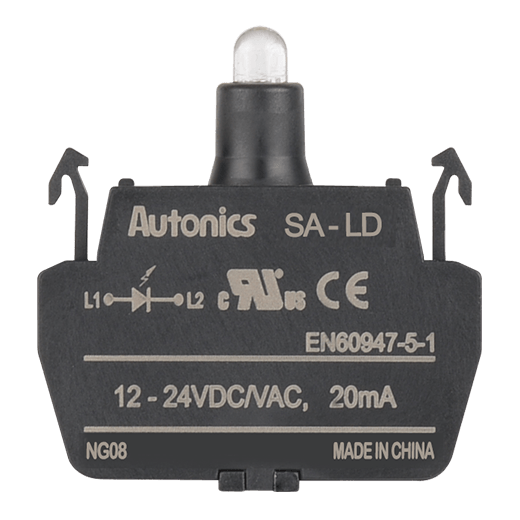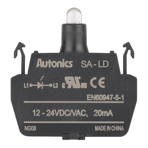 SA-LD Block luminoso LED diseño singular. Montaje posterior con conección tipo tornillo. Tensión nominal: 12-24VCA/CD. Color blanco. Accesorio para botonería/Luz piloto/selector de22/30mm. No soporta el ensamble de mas blocks LED.