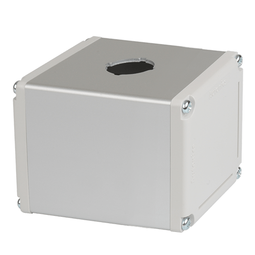 SA-SB1 Botonera metálica con perfil cuadrado para botonería de 22/25mm. 1 orificio. Dimensiones: 70HX86LX70Dmm.
