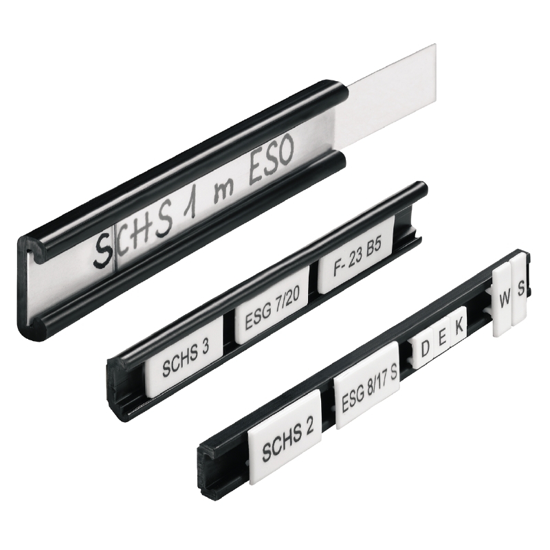 SCHS4 K . Porta etiqueta para etiquetas ESG, identificadores de clemas. Porta etiquetas gris de tamaño 10Hx1000Wmm y están fabricadas de polipropileno, con grado inflamabilidad según norma UL 94 de HB. Indicado para una temperatura de trabajo desde -40°C hasta +80°C. Para más información, consulte la ficha técnica.