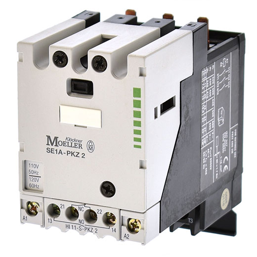 SE1A/11-PKZ2(110V50Hz,120V60Hz) Contactor magnético trifásico con auxiliar 1NA+1NC, tensión de bobina de 120VCA, indicado para una carga de 9A, 15HP a 220VCA/30HP a 440VCA, temperatura de operación de -25/+60, grado de protección IP20, cumple con los estándares IEC/EN 60947, VDE 0660, UL, CSA.