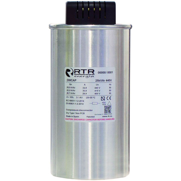 TER Capacitor de potencia trifásico para corrección de factor de potencia. Potencia de 10kVAR a una tensión de operación de 240VCA. Capacitancia nominal: 3x153.51µF. Corriente nominal: 24.06A.