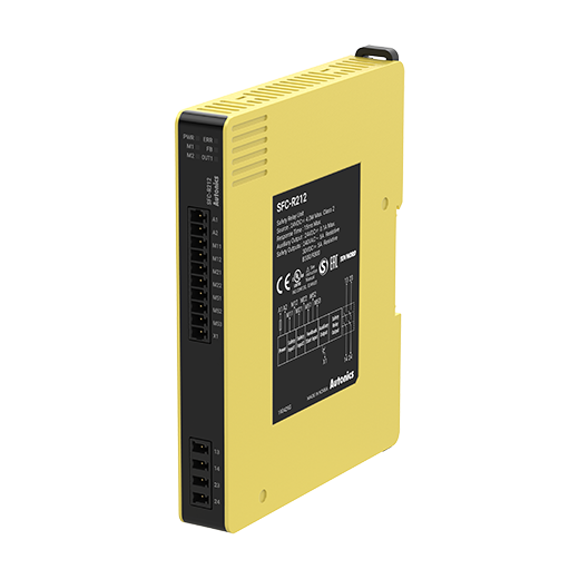 SFC-R212-L Relé de seguridad. Composición de contactos: Salida de seguridad 2NA, salida auxiliar PNP. Conexión de terminales de tipo sin tornillos. Tensión de alimentación: 24VDC.