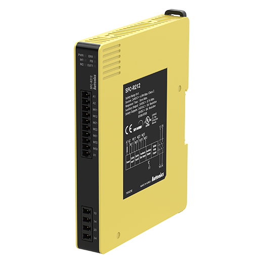 SFC-R212 Relé de seguridad. Composición de contactos: Salida de seguridad 2NA, salida auxiliar PNP. Conexión de terminales de tipo tornillo. Tensión de alimentación: 24VDC.