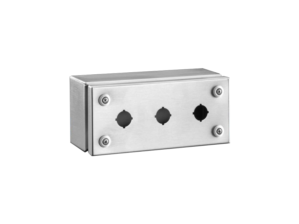 2384.030 SM Caja para botones con orificios 22mm, de acero inoxidable 1.4301 (AISI 304). 3 orificios. Dimensiones: 100x220x90mm. Unidad de embalaje: caja con tapa, cierre rápido incl. casquillos de plástico. Grado de protección IP66, NEMA 4X. Aprobaciones: GOST, RRR.