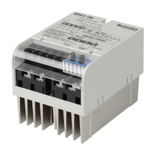 SPC1-35-E Controlador de potencia monofásico con disipador de calor integrado. Indicado para una corriente de carga nominal de 35A a una tensión de 220VCA. Control de entrada 1-5 VCC, CC 4-20 mA (250 O), ON/OFF (contacto externo o 24 VCC). Montaje a panel. Dimensiones de 124.8Hx94.6Wx136.9Dmm.