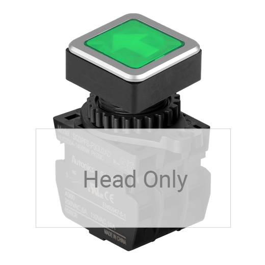 SQ3PFS-P3GU Botón pulsador. Para orificio de montaje de 30mm de diámetro. Diseño rasante con accionamiento momentáneo. Color verde. Unidad básica (Cabezal con adaptador), los contactos se venden por separado. Grado de protección IP52.