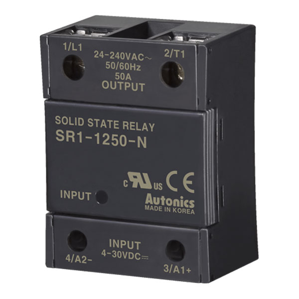 SR1-1250-N SSR Relevador de estado sólido monofásico. Tensión de control de 4-30VCD, indicado para una corriente de carga nominal de 50A a tensión de 24-240VCA. Función de cruce por cero. Montaje a panel. Dimensiones de 58Hx44Wx28.3Dmm. Rigidez dieléctrica de 2500 VCA 50/60 Hz 1min. Temperatura de trabajo de -20 a 70°C. Aprobaciones CE, cRU us.