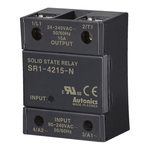 SR1-4215-N SSR Relevador de estado sólido monofásico. Tensión de control de 90-240VCA, indicado para una corriente de carga nominal de 15A a tensión de 24-240VCA. Función de cruce por cero. Montaje a panel. Dimensiones de 58Hx44Wx28.3Dmm. Rigidez dieléctrica de 2500 VCA 50/60 Hz 1min. Temperatura de trabajo de -20 a 70°C. Aprobaciones CE, cRU us.