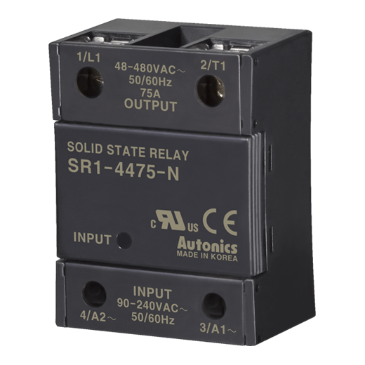 SR1-4475-N SSR Relevador de estado sólido monofásico . Tensión de control de 90-240VCA, indicado para una corriente de carga nominal de 75A a tensión de 48-480VCA. Función de cruce por cero. Montaje a panel. Dimensiones de 58HX44WX28.3Dmm. Rigidez dieléctrica de 2507 VCA 50/60 Hz 1min. Temperatura de trabajo de -20 a 70°C. Aprobaciones CE, cRU us.