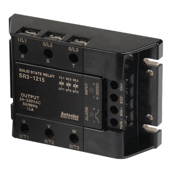 SR3-1215 SSR Relevador de estado sólido trifásico. Tensión de control de 4-30VCD, indicado para una corriente de carga nominal de 15A a tensión de 24-240VCA. Función de cruce por cero. Montaje a panel. Dimensiones de 100Hx130Wx112.7Dmm. Rigidez dieléctrica de 2500 VCA 50/60 Hz 1min. Temperatura de trabajo de -30 a 70°C. Aprobaciones CE, cRU us.