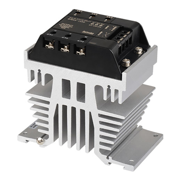 SRH3-1250 SSR Relevador de estado sólido trifásico con disipador de calor integrado. Tensión de control de 4-30VCD, indicado para una corriente de carga nominal de 50A a tensión de 24-240VCA. Función de cruce por cero. Montaje a panel/riel DIN. Dimensiones de 80Hx144.5Wx132Dmm. Rigidez dieléctrica de 4000 VCA. Temperatura de trabajo de -30 a 70°C. Aprobaciones CE, cRU us.