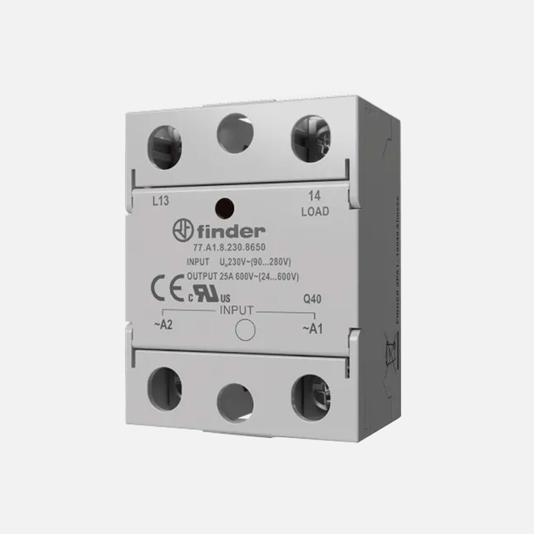 77.G1.9.024.8650 SSR Relevador de estado sólido monofasico. Tensión de control de 24VCD. Indicado para una corriente de carga nominal de 100A a una tensión de 600VCA. Función de cruce por cero. Montaje a panel. Dimensiones de 59Hx45Wx29Dmm. Rigidez dieléctrica de 4000VCA. Vida eléctrica 10x106 ciclos. Temperatura de trabajo de -30°C~80°C. Aprobaciones: CE, UKCA, EAC, cRUus. Ideal para aplicaciones como; Control de calentadores.