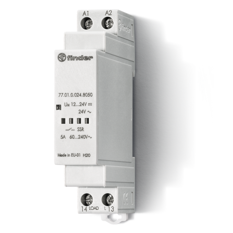 77.01.9.024.8050 SSR Relevador de estado sólido monofásico. Tensión de control de 9.8-32VCD/16-32VCA. Indicado para una corriente de carga nominal de 5A a una tensión de 48-265VCA. Función de cruce aleatorio. Montaje a riel DIN. Dimensiones de 88.8Hx17.5Wx60.8Dmm. Rigidez dieléctrica de 2500VCA. Vida eléctrica 10x106 ciclos. Temperatura de trabajo de -30°C~80°C. Aprobaciones: CE, UKCA, EAC, cRUus. Ideal para aplicaciones como; Control y regulación fina que precise de tiempos de conexión y desconexión cortos (especialmente el mando de motores). Fase de alimentación en CA diferente a la fase de la carga en CA.Cargas trifásicas.