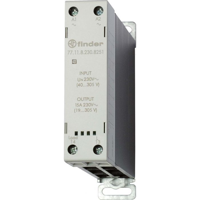 77.11.8.230.8251 SSR Relevador de estado sólido monofásico con disipador de calor integrado y tapa de plástico. Tensión de control de 40-305VCA. Indicado para una corriente de carga nominal de 15A a una tensión de 19-305VCA. Función de cruce aleatorio. Montaje a riel DIN. Dimensiones de 104.5Hx22.5Wx120.3Dmm. Rigidez dieléctrica de 3000VCA. Vida eléctrica 10x106 ciclos. Temperatura de trabajo de -30°C~80°C. Aprobaciones: CE, UKCA, EAC, cRUus. Ideal para aplicaciones como; Control y regulación fina que precise de tiempos de conexión y desconexión cortos (especialmente el mando de motores).