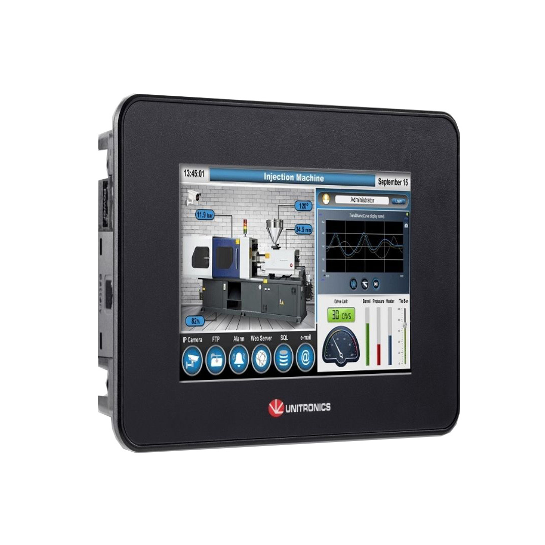 UniStream®Built-in Potente controlador lógico programable con pantalla táctil HMI de alta calidad (Standard). Multifunción en un perfil de hardware increíblemente compacto: PLC + HMI + E/S integrados en una sola unidad.. Pantalla táctil (Resistivo, analógico) a color 5” LCD TFT (65.536 colores, resolución de 16 bits). Resolución: 800x480 píxeles (WVGA). Cuenta con entradas: 14 entradas digitales PNP o NPN (posibilidad de configurar dos entradas de contador rápido HSC de 90 kHz a 32 bits), 2 entradas analógicas de 14 bits (0-10V, 0-20mA, 4-20mA) y 2 entradas de temperatura aisladas (Termopar, PT100/NI100/NI120/PT1000/NI1000); salidas: 8 salidas digitales tipo relé y 2 salidas analógicas (0-10V, ± 10V, 0/4-20mA). Tensión de alimentación: . Características adicionales: PLC con servicios en la nube integrados y sin costo. Simplemente conecte el PLC a ‘UniCloud’, el servicio en la nube de Unitroncis, diseñe un panel de control sin código y comience a funcionar en menos de 30 minutos..