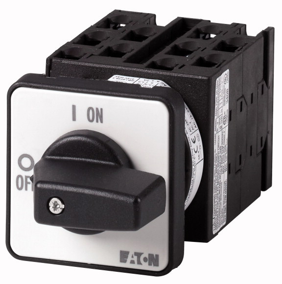 T0-5-15876/E Interruptor-seccionador de levas estrella-delta reversible, con dirección de funciónamiento bidirecciónal. Con manija tipo palanca negra y placa frontal. 3 polos. 10 contactos. Diseño de placa frontal: FS638. Corriente nominal: 20A. Potencia bajo clasificación del motor AC-23A: 6.5Kw a 440 VCA. Montaje: empotrar. Angulo de operación: 60°. Grado de protección IP: IP65.