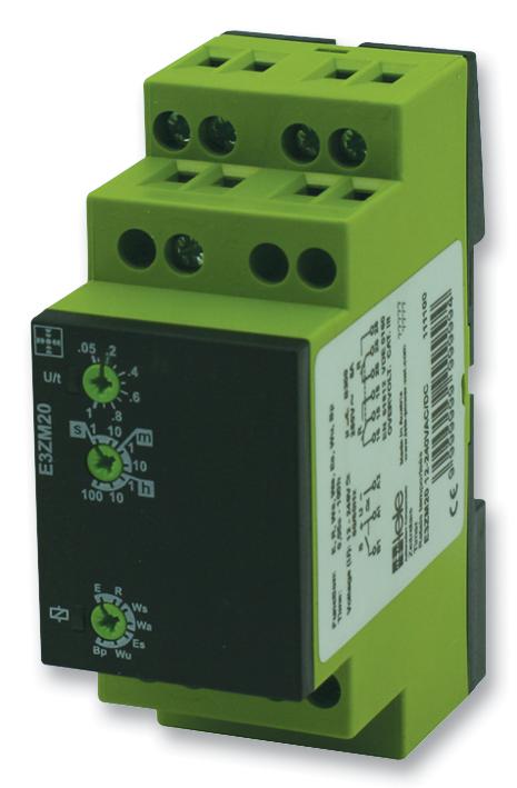 T111100 E3ZM20 Relé temporizador. Generador de impulsos (1s-100h). Alimentación: 12–240VUC. Cuenta con 2CO. Funciones: Retardo de encendido; Retardo de liberación; Retardo de encendido con contacto de control; Conmutación en apagado con contacto de control; Conmutación en encendido con control de tensión; Conmutación en encendido con tecla de prueba / contacto de control. Aprobaciones: CE, cULus, EAC.