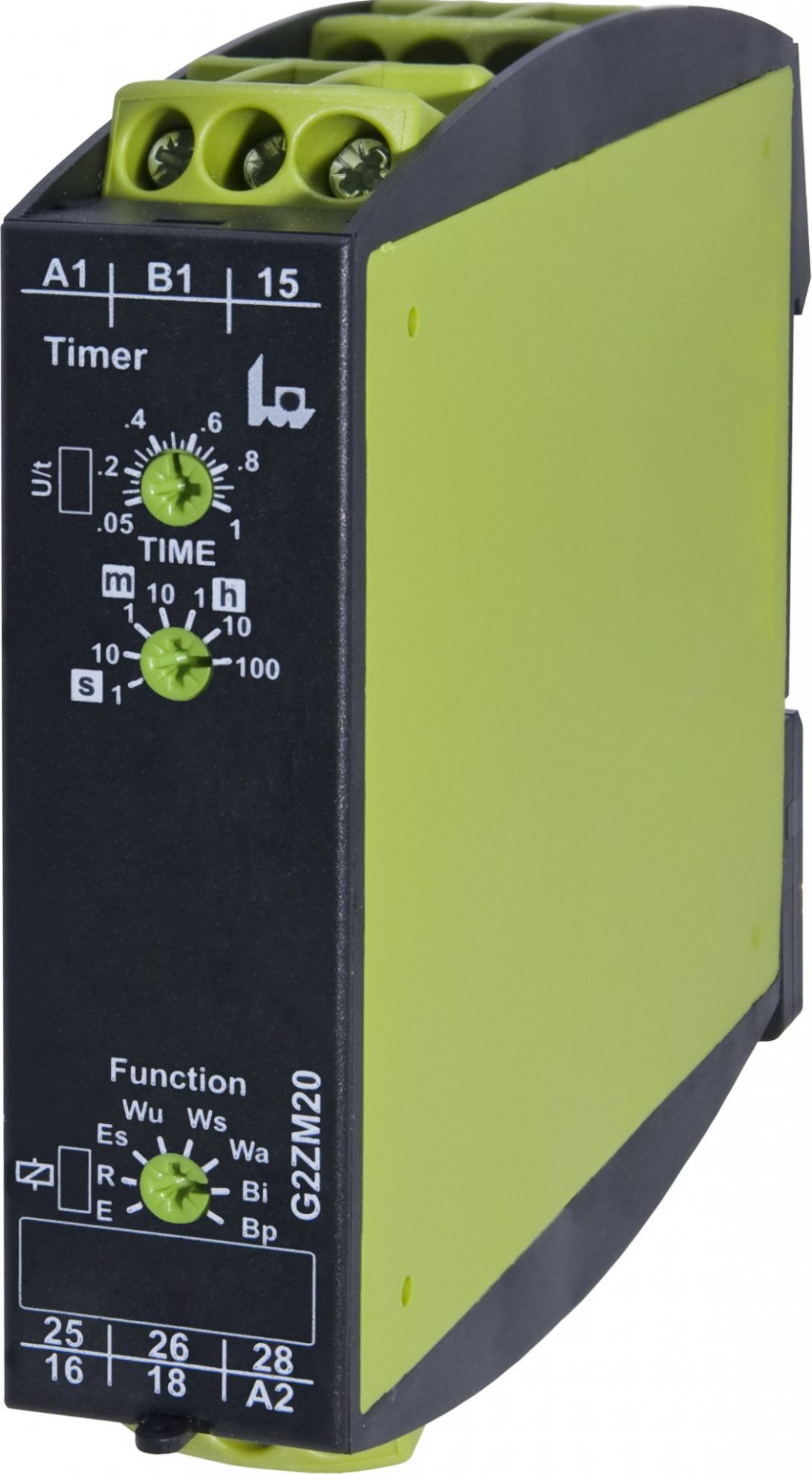 T120401 G2ZM20 Relé temporizador. Multifunción (1s-100h). Alimentación: 12–240VUC. Cuenta con 2CO. Funciones: Retardo de encendido; Retardo de liberación; Retardo de encendido con contacto de control; Conmutación en encendido con control de tensión; Conmutación en encendido con contacto de control; Conmutación en apagado con contacto de control; Intermitente inicia con impulso; Intermitente inicia en pausa. Aprobaciones: CE, cULus, EAC.