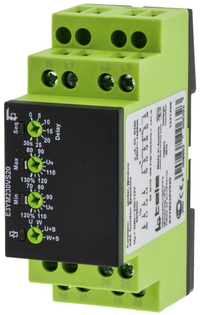 T1341406 E3YM230VS20 Monitor de voltaje. Monitorización de tensión en redes de 3 + 1 fases (L1+L2+L3+N) con contacto de señalización remota (R) 2CO. Rangos de medición: 230/132VCA. Funciones: Baja tensión; Ventana; Secuencia de fases; Fallo de fase. Aprobaciones: CE, EAC