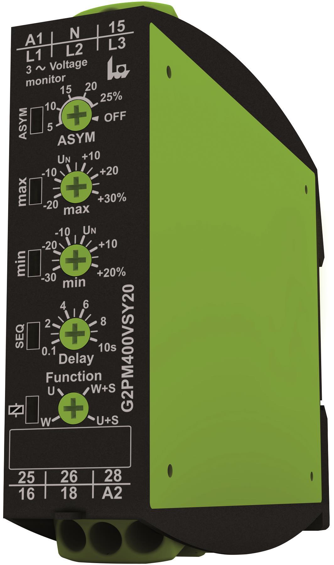 T2390505 G2PM400VSY20 Monitor de voltaje. Monitorización de tensión en redes trifásicas. (L1+L2+L3+N) con contacto de señalización remota (R) 1CO. Rangos de medición: 400/230VCA. Funciones: Baja tensión; Ventana; Secuencia de fases; Fallo de fase; Asimetría. Aprobaciones: CE, cULus, EAC
