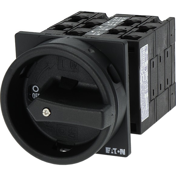 T3-4-15682/EA/SVB-SW Interruptor-seccionador de levas principal, usado como paro de mantenimiento y/o reparación. Con manija giratoria negra y anillo de bloqueo, bloqueable en posición 0 (off). 6 polos + 1NA1NC. Corriente nominal: 32A. Potencia bajo clasificación del motor AC-23A: 13Kw a 440 VCA. Montaje: empotrar. Angulo de operación: 90°. Grado de protección IP: IP65.