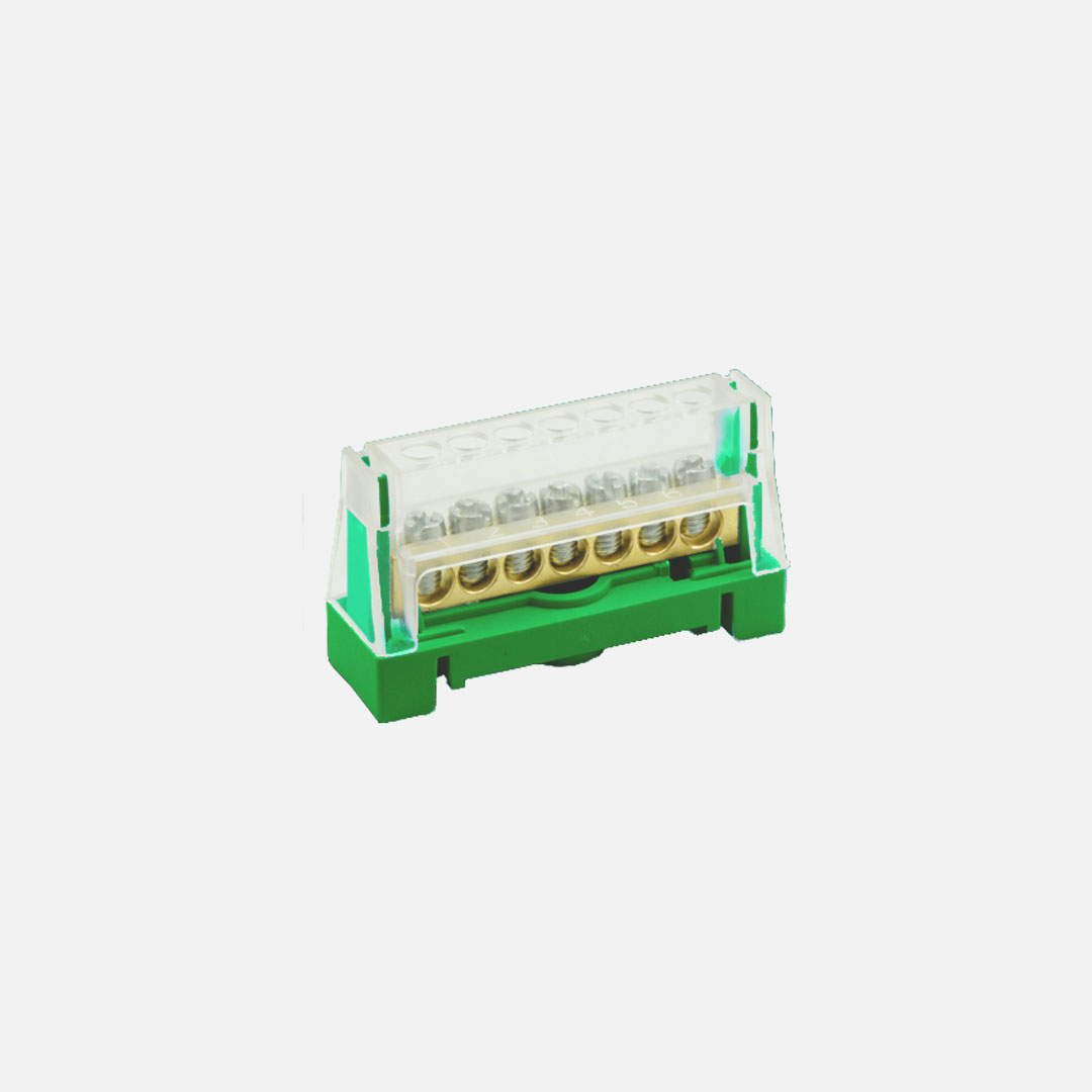 Terminal de tierra fisica atornillada 7 orificios 2x6AWG + 5x8AWG 750VCA Verde