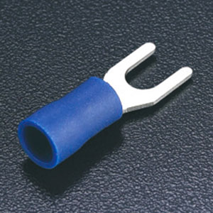 Terminal tipo espada/horquilla de cobre estañado con aislante de vinil. Indicado para un calibre de 1.5-2.5mm² (16-14AWG). Barreno de M5 / 3/16". Dimensiones: 21.0mm de longitud total, 10mm longitud de aislante. Empaquetado de 100 piezas. Color azul. Apro