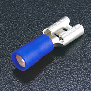 Terminal tipo faston hembra de latón estañado con aislante de vinil. Indicado para un calibre de 1.5-2.5mm² (16-14AWG). Conexión a terminal plana de 6.3X0.8mm. Dimensiones: 20.8mm de longitud total, 10.5mm longitud de aislante. Empaquetado de 100 piezas.