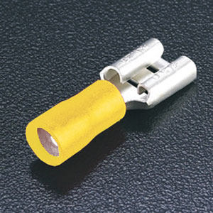 Terminal tipo faston hembra de latón estañado con aislante de vinil. Indicado para un calibre de 4-6mm² (12-10AWG). Conexión a terminal plana de 6.3X0.8mm. Dimensiones: 23.3mm de longitud total, 13.0mm longitud de aislante. Empaquetado de 100 piezas. Colo