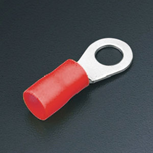 Terminal tipo ojillo de cobre estañado con aislante de vinil. Indicado para un calibre de 0.5-1.5mm² (22-16AWG). Barreno de M8 / 5/16". Dimensiones: 26.8mm de longitud total, 10mm longitud de aislante. Empaquetado de 100 piezas. Color rojo. Aprobaciones: