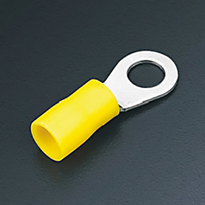 Terminal tipo ojillo de cobre estañado con aislante de vinil. Indicado para un calibre de 4-6mm² (12-10AWG). Barreno de M10 / 3/8". Dimensiones: 34.0mm de longitud total, 13mm longitud de aislante. Empaquetado de 100 piezas. Color amarillo. Aprobaciones: