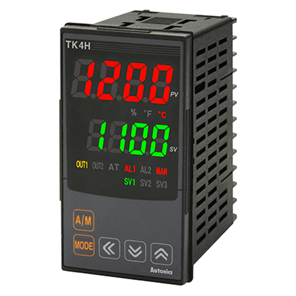 TK4H-A4RN Controlador de temperatura/procesos PID estándar de alta precisión de 4 dígitos. Diseñado para control estándar. Ciclo de muestreo de 50ms. Tamaño DIN 48WX96H con profundidad de 64.5Dmm. Salida de control 1 tipo: Relay. 2 alarma. Tensión de alim. 100-240VCA