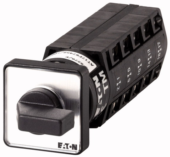 TM-5-8247/E Mini-Interruptor de levas, interruptor de control, con posición 0 (Off), 9 pasos. Un contacto cerrado por paso, con manija tipo palanca negra y placa frontal. 1 polos. 9 contactos. Diseño de placa frontal: FS007. Corriente nominal: 10A. Montaje: empotrar. Angulo de operación: 45°. Grado de protección IP: IP65.